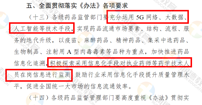 根据国家药监局发布《药品经营和使用质量监督管理办法》(征求意见稿)强调,各级药品监管部门要充分运用5G网络、大数据、人工智能等技术手段,实现药品流通市场要素、结构、流程、服务的迭代升级,加快推进药品信息化追溯,积极探索采用信息化手段对执业药师等药学技术人员在岗信息进行监测,鼓励行业采用信息化手段提升质量管理水平,促进全国统一大市场的信息流通效率。