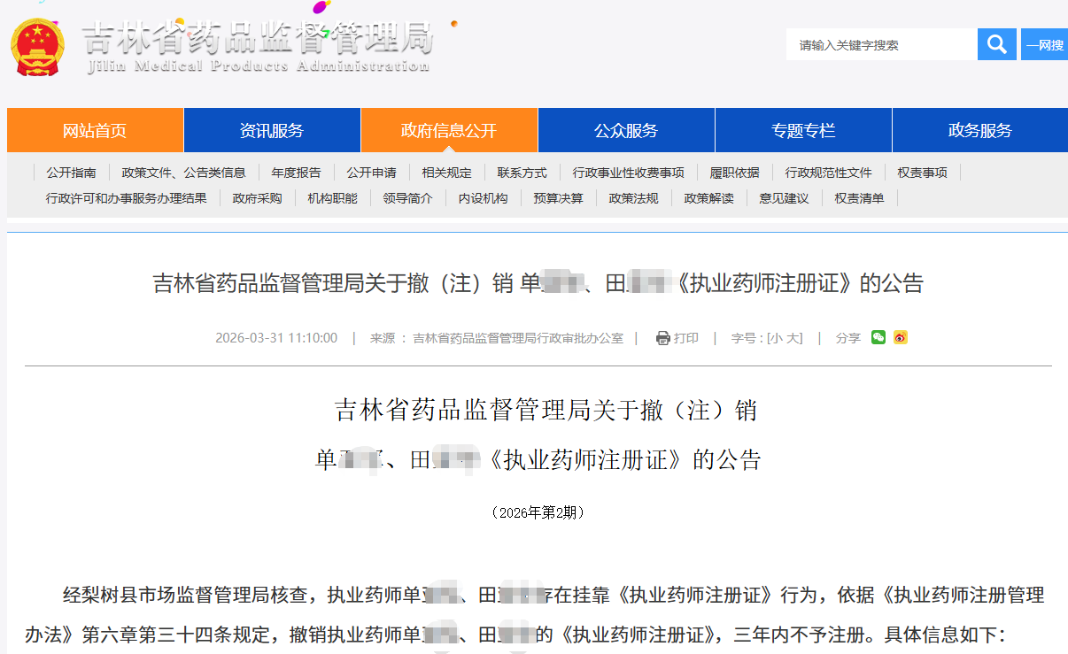 吉林:2名执业药师挂证